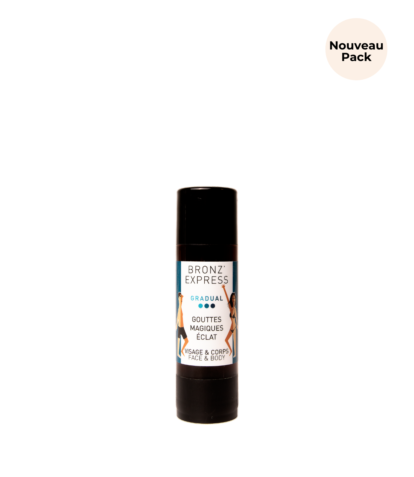 Morning or evening, mix in the palm of your hand a few "Magic Radiance Drops" with your usual care and apply in light massages on the face, neck and décolleté, avoiding the hairline and eyebrows. For each area of the body (legs, arms, stomach, back…), mix a few drops. Wash hands with cold water after use. Bronz'Express advice: Depending on the result obtained, the quantity of drops should be adjusted according to the skin tone and desired complexion.