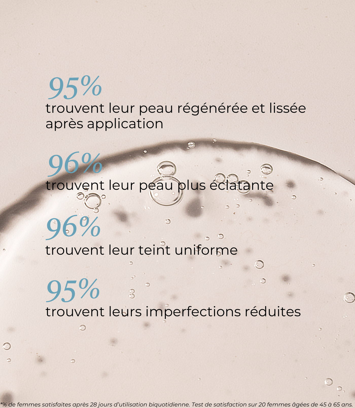 A "new skin" effect lotion concentrated in exfoliating active ingredients to regenerate the skin by eliminating dead cells without mechanical friction.