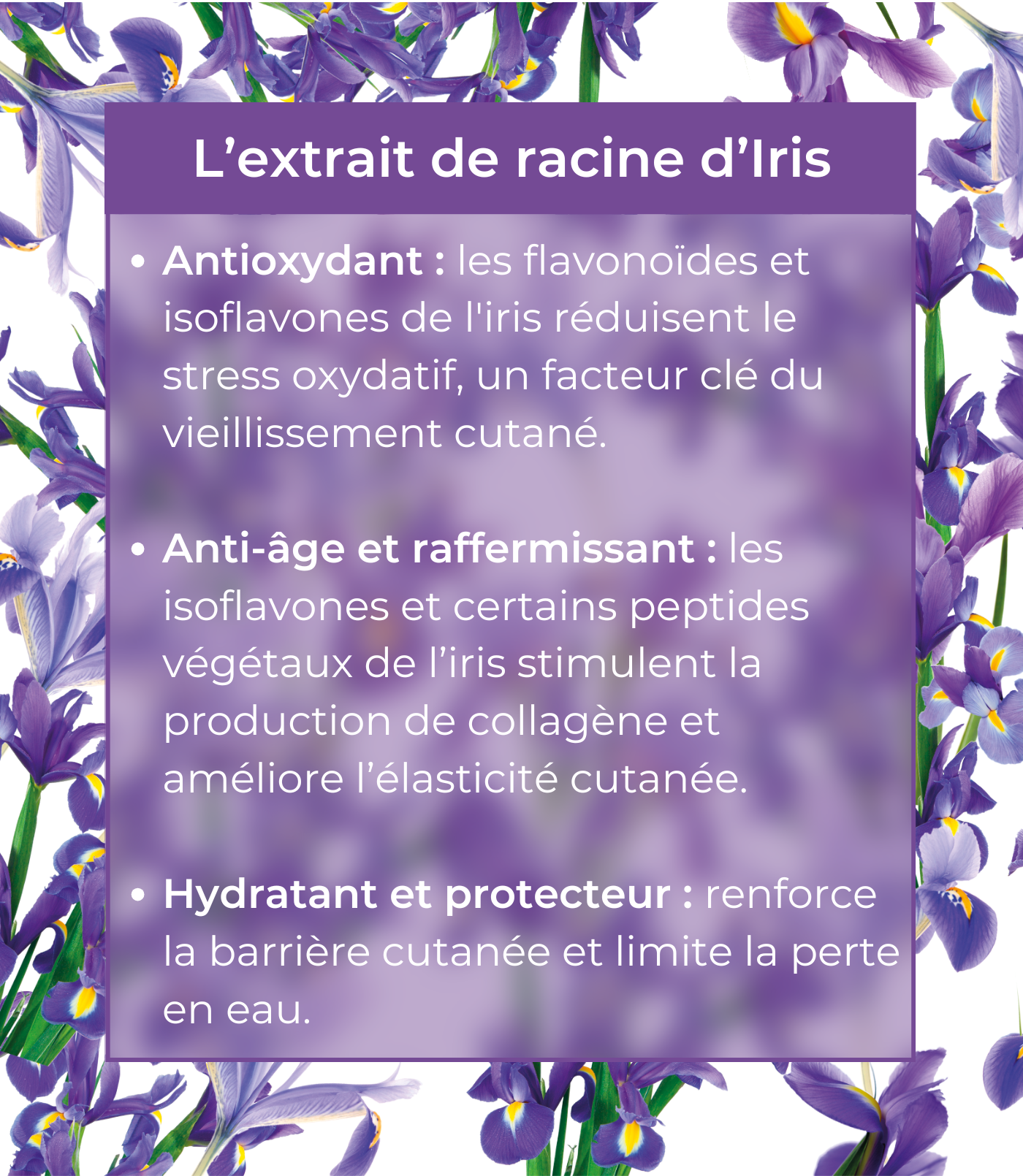 Gracias a las propiedades anti-edad del Extracto de Iris, esta crema mejora el tonicidad y la función barrera de la piel para preservar su juventud.